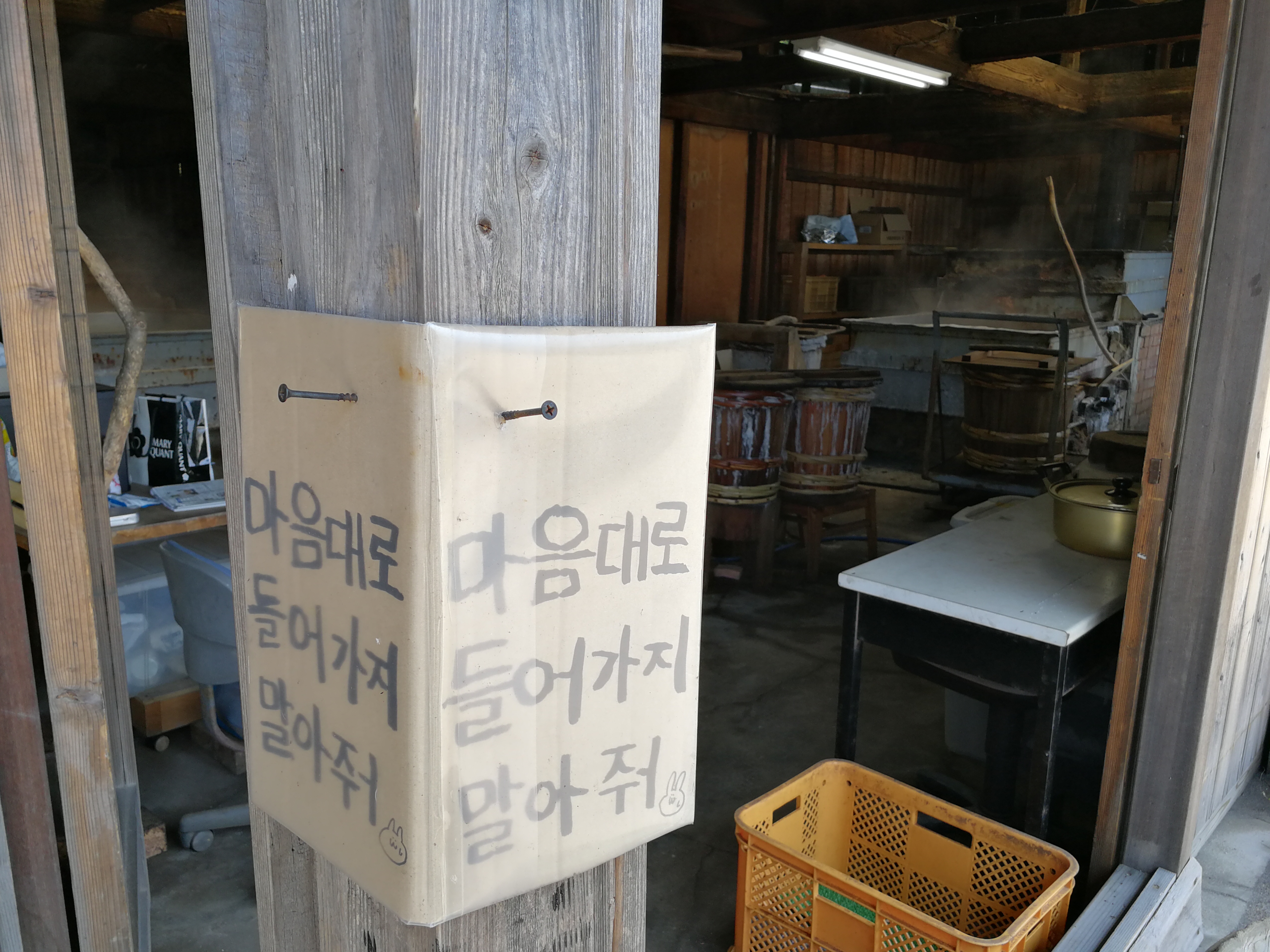 안으로 사람들이 들어오지 못하도록 '마음대로 들어가지 말아줘' 라고 적혀있습니다.